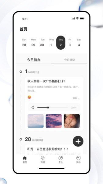 【今日随记】:提供便捷的灵感记录功能,支持文字、图片、语音等多种记录方式,方便用户随时捕捉生活中的创意灵感、重要信息和突发事项。所有记录内容都会自动同步到云端,确保数据安全不丢失。