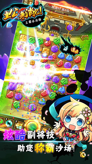 2、在保留经典三消模式的基础上,游戏独创了武将单挑系统。玩家可以召唤三国名将出战,与敌方武将进行一对一的消除对决。每个武将都有专属的消除技能,让战斗更具策略性。