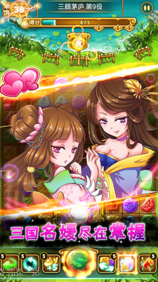 3、游戏精心设计了多位三国武将,每位武将的技能都充分体现了其历史特性。更有7位三国美女作为辅助角色,她们各具特色的能力将帮助玩家在消除战斗中取得胜利,最终成就霸业。