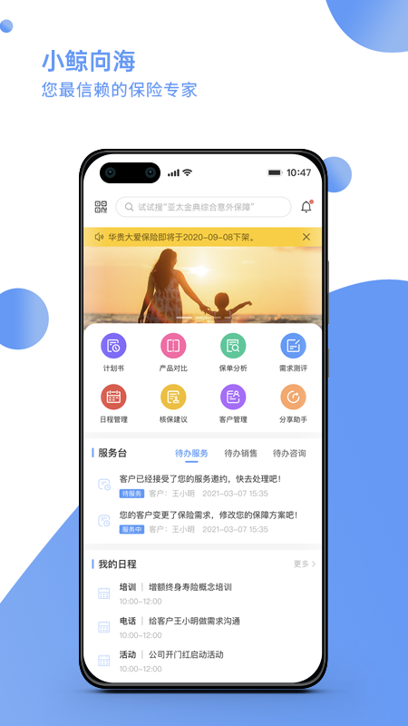 小鲸向海签约保险专家的一站式智能化工具,致力于为保险从业者打造全方位的展业支持平台。该应用不仅提供海量优质保险产品资源,更配备了专业的客户需求分析系统,能够根据客户实际情况生成个性化的保障方案建议。代理人可以通过app快速获取客户保障需求测评结果,查看详细的保障分析报告,进行多维度产品对比,并一键生成智能保障方案。这些功能大大简化了传统保险销售流程,让代理人能够将更多精力投入到客户服务和关系维护中,有效提升成交转化率。