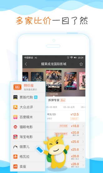 ◆猫眼,糯米,淘票票,娱票,格瓦拉,卖座,多渠道比价:实时同步各大票务平台价格,确保用户买到最低价电影票