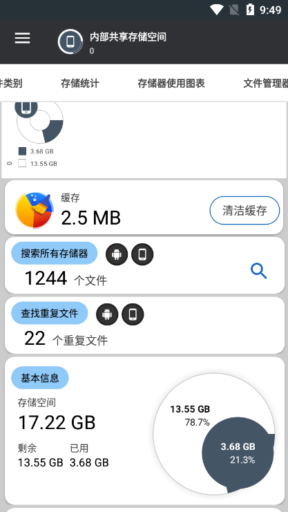 该应用将每个挂载点以饼图形式直观展示,详细标注已用和剩余空间比例,并支持按文件类型(文档、图像、视频、音乐等)和扩展名(如MP3、WMA等音频格式)进行智能分类。系统通过解析挂载点配置文件vold.fstab获取存储分区信息,确保数据准确性。用户可以通过颜色区分的扇形区块快速识别各类文件占比,还能通过点击查看每个分类下的具体文件列表,实现精准的存储空间管理。