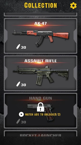 1、游戏主界面将武器分为机械枪和科幻枪两大类别,每类都包含数十种不同型号的枪械,玩家可以通过滑动屏幕浏览所有可选武器;