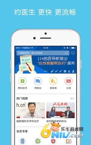 1、首先下载并打开114名医导航app,完成注册登录后进入首页。首页设计简洁明了,设有预约挂号、预检台、查疾病、公告等核心功能入口,同时还提供热门医疗科普视频。点击预约挂号按钮即可开始挂号流程。