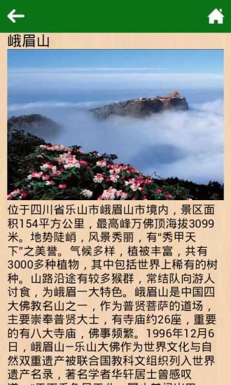 峨眉山旅游手机版是一款专为游客打造的智慧旅游应用,让您轻松畅游这座被誉为"天下第一秀"的佛教名山。作为国家5A级景区,峨眉山以其险峻的山势、秀丽的自然风光和深厚的文化底蕴吸引着海内外游客。这款APP整合了景区导览、票务预订、住宿餐饮等全方位服务,通过智能路线规划、语音讲解等功能,为您带来便捷高效的旅行体验。无论是想朝拜金顶普贤菩萨,还是探寻峨眉灵猴的踪迹,这款APP都能成为您贴心的旅行助手。