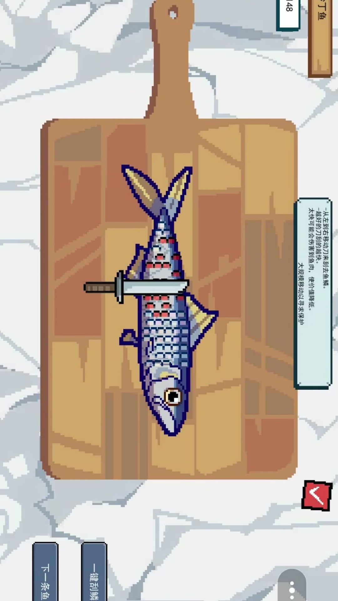 新增的4人实时对战让你和朋友比拼刮鳞技巧,在限定时间内看谁处理得又快又干净。特殊的大胃王模式要求边刮鳞边喂食饥饿的海鸥,混乱中可能被抢走整条鱼。天梯排行榜每月刷新,顶级玩家将获得限定皮肤和现实中的专业刮鳞工具套装。观战系统支持慢动作回放精彩操作,学习高手如何用最简路径刮除复杂鳞片。赛季主题会改变竞技规则,比如当前的海盗赛季中,刮下的鳞片能作为炮弹攻击对手的工作台。