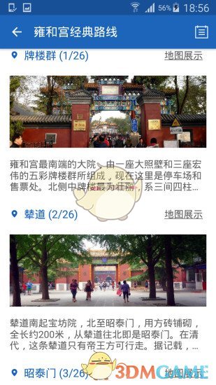 攻略板块提供详尽的景点门票、交通方式、住宿推荐、特色商店等实用信息,帮助您轻松规划行程。线路功能不仅包含景区内经典游览路线,还能根据您的兴趣偏好和游览时间智能生成个性化路线推荐。游记功能让您随时记录旅行见闻,支持添加照片、文字和定位信息,生成专属的旅行纪念册。文摘板块汇集了大量关于雍和宫的历史文献、建筑解析和文化解读,让您在游览之余深入了解这座皇家寺庙的深厚底蕴。应用还特别加入了3D全景展示功能,让您足不出户就能360度欣赏雍和宫的建筑之美。