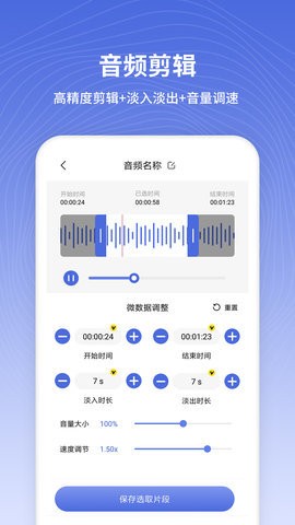 多种音频素材选择:除了内置素材库外,软件还支持从本地导入音频文件进行编辑。用户可以直接使用手机中的音乐文件,或者从其他音频app导入素材。软件内置的音频修复工具可以优化导入音频的质量,即使是低质量的录音文件也能处理成可用的铃声素材。