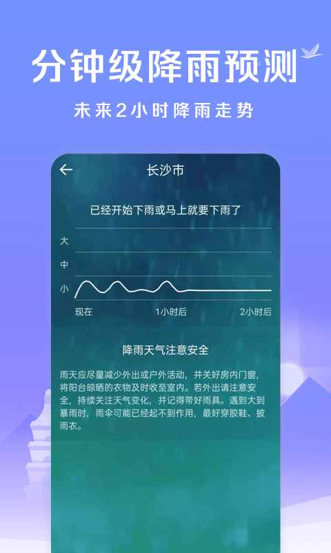 逐分钟降雨:基于先进的气象算法,可精确预报未来2小时内的降雨情况,提供分钟级别的降雨动态,包括雨量大小和持续时间预测。