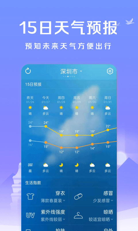 15天天气:提供长达15天的天气预报数据,支持查看温度、降水概率等详细参数,帮助用户提前规划重要行程和户外活动安排。