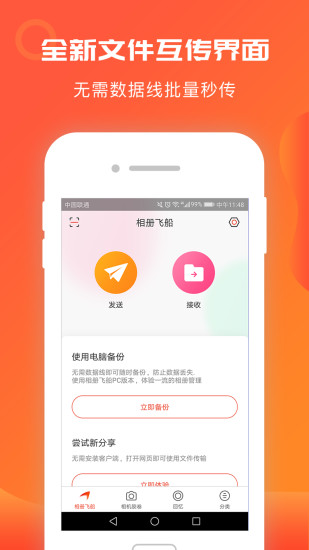 相册飞船让照片视频传输彻底告别流量消耗!它不仅可以帮助你快速清理手机内存,还能将照片备份到电脑,充分利用闲置电脑的存储空间。手机间的互传速度惊人,比传统蓝牙快50倍,即使在没有网络的情况下也能轻松分享旅行照片。对于淘宝卖家或微商用户,相册飞船更是神器般的存在,商品图片秒传无需等待下载。无论是个人用户还是商业用途,相册飞船都能提供高效便捷的照片管理解决方案。