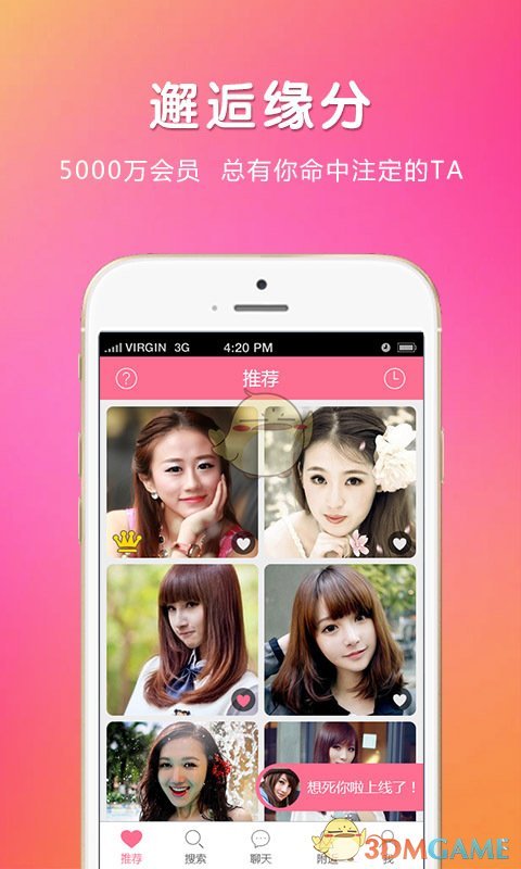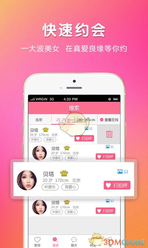 2、即时聊天系统让你随时随地与心仪的异性交流,一键打招呼功能让你不错过任何心动瞬间,专业匹配算法为你精准推荐合适的对象;