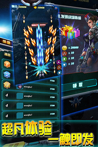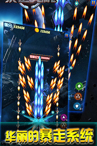 游戏最具特色的暴走玩法让你在收集特定道具和宝石后进入暴走状态,此时战机将获得攻击力提升、子弹加速等强力增益效果,助你快速清屏消灭敌人!