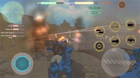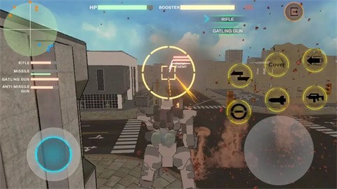 游戏采用直观的双摇杆操控方式,左侧虚拟摇杆控制机器人移动,右侧按钮负责射击和特殊技能。玩家需要灵活移动准星,在高速战斗中精准锁定目标,同时注意走位躲避敌方火力,才能战胜越来越强大的对手。