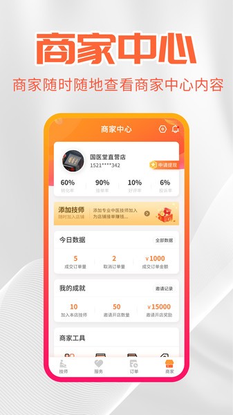 用户可通过"尚约"APP预约中医推拿、通络调理、产后修复等多种专业理疗服务。商家通过"尚约商家端"APP可实时接收订单信息,并关联店内技师资源,实现线上接单、线下服务的无缝衔接,大幅提升服务响应速度。