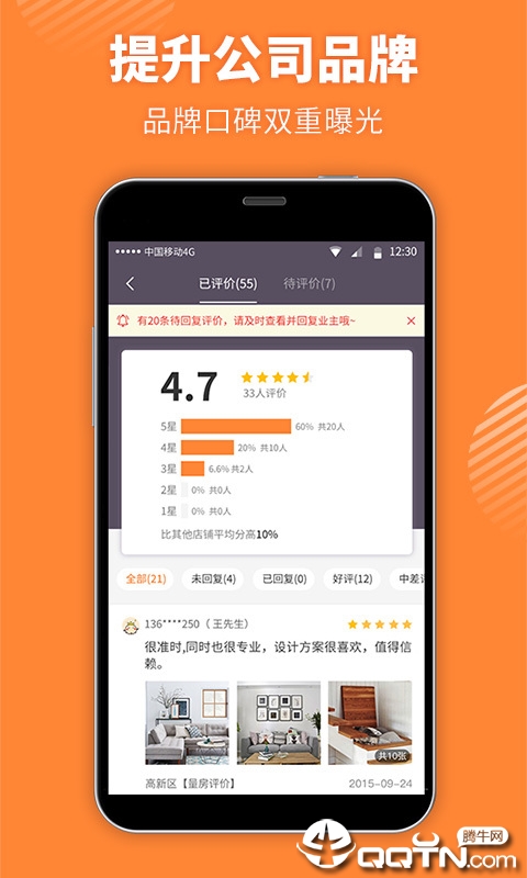 【获取海量订单】平台注册业主突破2000万,每日新增装修需求数千条,通过智能匹配算法将精准订单推送给商家,手机接单打破时间空间限制。
