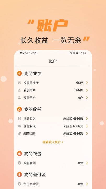 点击账户,可以查看我的业绩,我的收益,以及备付金;业绩数据实时更新,支持多维度统计分析,帮助代理商更好地掌握业务情况。
