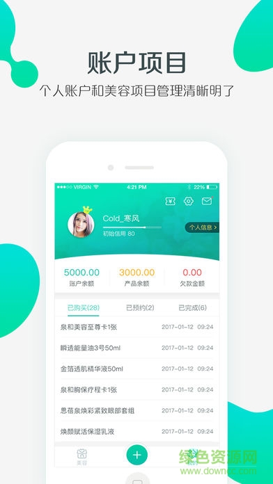 -个人账户和美容项目管理:详细记录个人肤质数据、护理历史和美容项目进度