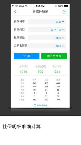 2:智能计算社保费用明细,根据用户所在城市、缴费基数等参数,精准测算每月应缴金额,同时提供养老金预测功能,让用户清晰了解未来可享受的社保待遇。