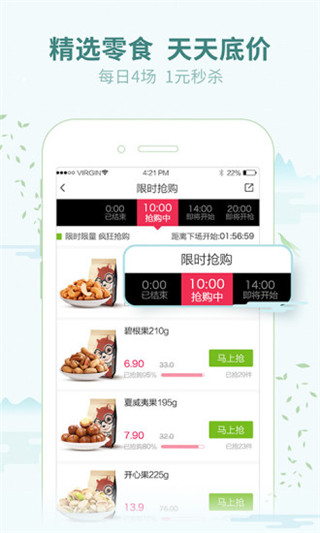 4、限时抢购:每天4个时段推出的超值抢购活动,精选夏威夷果、碧根果等爆款零食1元起售。这些抢购商品都是经过严格筛选的高人气产品,不仅价格优惠,品质也有保障。抢购前系统会提前推送提醒,并支持预约抢购功能,确保用户不错过任何超值机会。