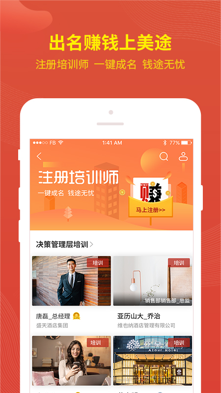 【培训共享】上美途提供专业培训课程和认证体系,帮助酒店从业者提升技能。通过平台认证的培训师可获得更多曝光机会,实现名利双收,打造个人品牌影响力。