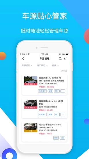 提升了车源信息的传播效率,才可以及时的进行车源信息整理:独创的车源信息智能优化算法,自动生成优质文案和展示排序,提升30%以上点击率;