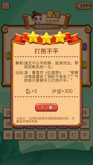 游戏采用渐进式难度设计,玩家从初级学童开始,随着答题正确率的提升可以逐步升级为秀才、举人等更高等级,题目难度也随之增加。这种成长系统既增加了游戏的挑战性,又让玩家获得持续的成就感。游戏还特别注重知识性,每个成语都配有详细的解释和出处,帮助玩家在娱乐中真正掌握成语知识。