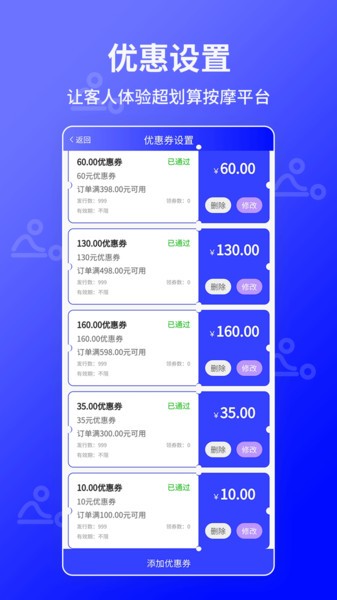 1、商户可自主设置服务项目、定价策略,并灵活发布各类优惠券、促销活动,所有操作简单易上手,无需专业技术支持;