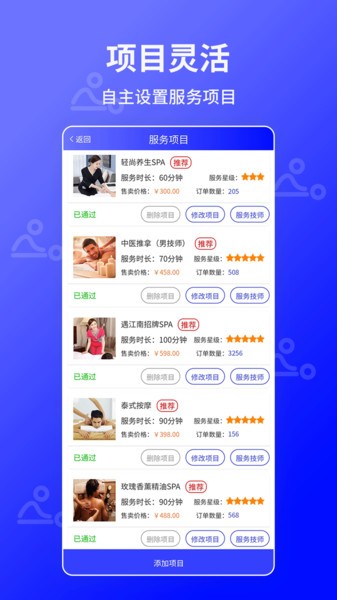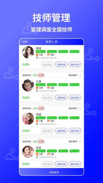 1、平台功能全面覆盖商户日常管理需求,包括订单处理、技师管理、客户沟通等,所有操作均可通过手机轻松完成,让商户随时随地高效办公;