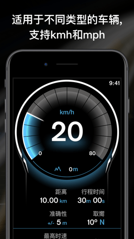 1、速度计主要包括最后几分钟。你可以为三种不同类型的道路设置限速。测试表明在城市道路环境下,其测速误差小于1%,比车载仪表盘更为精准可靠。