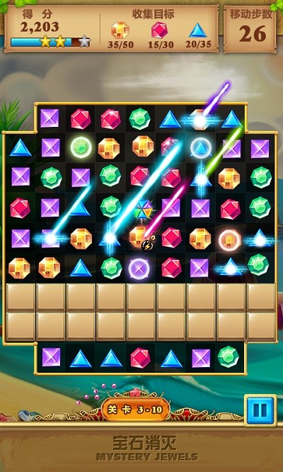 ·丰富的游戏关卡,在每一个关卡里都有着全新的游戏挑战:除了传统的三消玩法,游戏还融入了拼图、解谜等元素。特殊关卡需要玩家完成特定任务,如收集指定宝石、清除障碍物等。