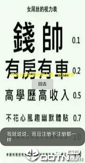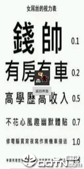 1、采用经典的点击操作玩法,将网络流行文化以视力表形式创新呈现。游戏画面采用夸张的恶搞风格,字体大小和排版都经过精心设计,既考验视力又考验脑洞。