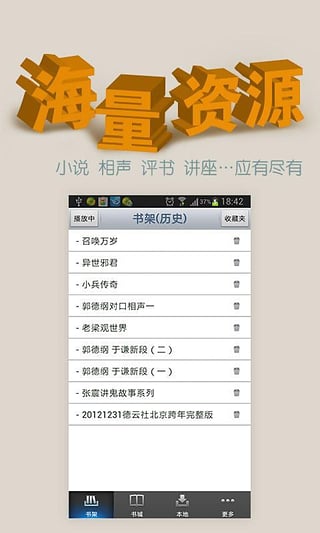 7、海量优质内容资源,拥有最全的郭德纲相声合集、数百部热门小说、上百集百家讲坛等精品内容,并持续更新扩充资源库。