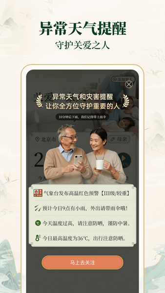 【关爱家人天气】:清晰展示多地天气,支持添加城市标签,添加多个远在他乡的家人地址,随时随地关注家人所在城市天气,让天气服务更有温度。独创"天气提醒"功能,当家人所在地出现极端天气时自动推送预警,可设置定时天气报告推送,支持多人共享天气信息,让关心突破距离限制。