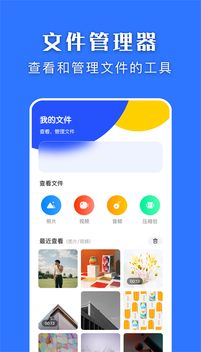 4、实用工具功能:提供手机清理、文件压缩等实用工具功能,提高用户生活质量:包含十余种实用小工具,如重复文件查找、大文件管理、应用缓存清理等。特别设计的文件压缩功能,可在保持质量的前提下大幅减小文件体积,方便存储和分享。