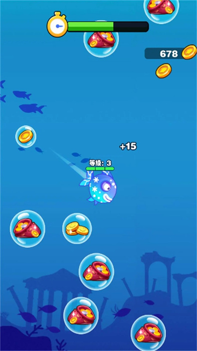 3、在闯关的过程中玩家还需要去躲避等级比自己高的鱼类不要被对方吸走血条,完成升级还可以获取神秘宝盒以及丰富的金币奖励。游戏设置了多种成就系统,完成特定挑战可以获得额外奖励。建议玩家在确保安全的前提下,尝试完成各种成就任务。