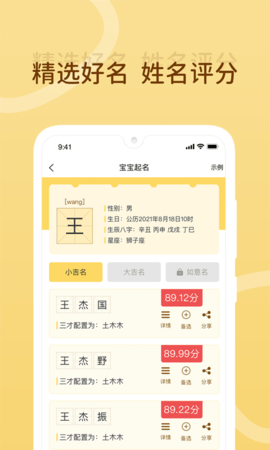 无论是生辰八字、生肖动物、喜好忌讳这些都可以,软件页面非常简约清新,功能也非常强大,并且里面提供在线测名服务。系统会详细解析每个名字的五行属性、三才配置、生肖宜忌等专业信息,让您全面了解名字的吉凶寓意。测名报告包含音律分析、字形解析等多项指标,帮助您做出最佳选择。