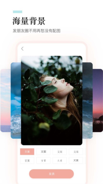 背景图片:提供数千张高清背景图片,涵盖风景、插画、抽象等多种风格。支持图片预览和编辑功能,可以添加文字、滤镜等效果,打造个性化朋友圈。