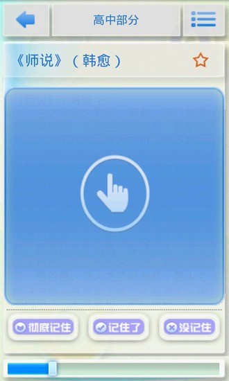 语文背诵(高中人教版)是一款专为高中生打造的语文学习辅助应用。该软件全面收录了高中三个年级人教版教材中要求背诵的文言文、古诗词、名言警句等重点内容,通过智能化的学习系统帮助学生高效记忆。软件采用科学的记忆曲线算法,结合音频朗读、译文解析等多媒体功能,让背诵变得生动有趣。无论在家还是外出,用户都能利用碎片时间进行学习,真正做到随时随地巩固语文知识。界面简洁友好,操作便捷,是高中生备战高考、提升语文素养的得力助手。