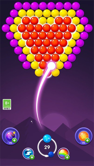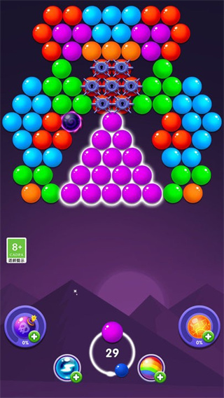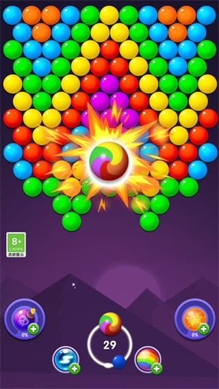 1、充满鲜艳色彩的泡泡,五彩缤纷的游戏画面,充满了吸引力。游戏采用高饱和度的色彩搭配,每个泡泡都经过精心渲染,在消除时会产生绚丽的粒子特效,为玩家带来视觉盛宴。2、采用了生动和可爱的画风风格画面,吸引更多玩家游玩。从呆萌的泡泡造型到Q弹的物理效果,整个游戏世界都洋溢着欢乐的气息,特别适合减压放松。3、设有了完善和丰富的道具系统,通过完成消除任务才能解锁。道具包括彩虹泡泡、炸弹泡泡等十余种特殊能力,合理使用可以事半功倍。4、包含了多种不同的关卡挑战性,能考验玩家的逻辑思维能力。500+精心设计的关卡涵盖多种解谜模式,从基础匹配到复杂连锁反应应有尽有。