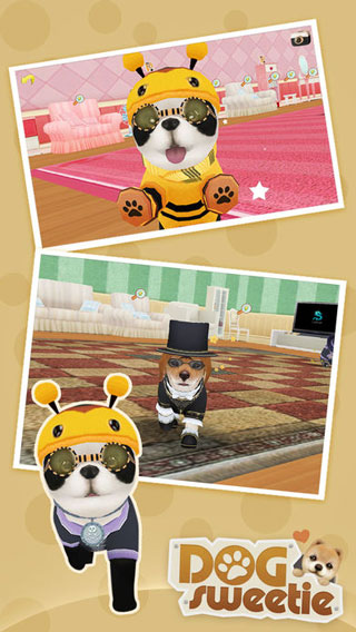4、个性功能:游戏提供了丰富的个性化定制选项,玩家可以为狗狗搭配各种时尚服饰,在房间内摆放不同风格的家具,甚至给狗狗贴上酷炫的纹身。所有装扮和家具都支持试穿试摆功能,让玩家找到最满意的搭配方案。