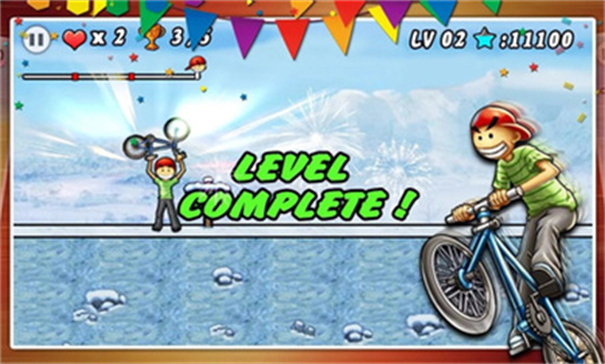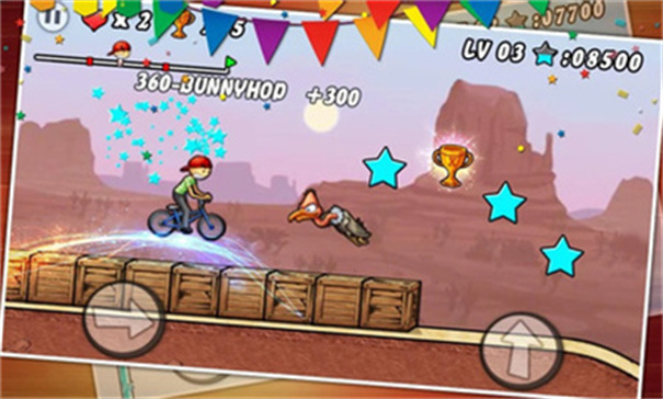 1、游戏突破传统跑酷模式,将自行车特技与节奏玩法完美融合,玩家可施展后轮滑行、空中转体等20余种专业动作。每个场景都设有隐藏捷径,比如森林关的树藤摆荡通道能节省30%路程。