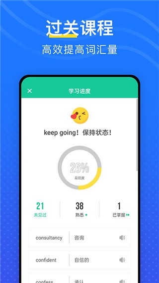 1.软件提供个性化学习功能,根据用户的学习习惯和进度,为用户量身定制学习计划,帮助用户高效记忆单词。系统会通过智能算法持续跟踪用户的学习数据,自动优化学习路径,确保每个阶段的学习内容都恰到好处地匹配用户当前水平。