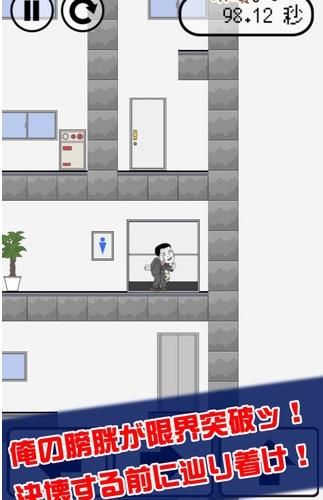 游戏主人公是一位身着西装的日本大叔。明明是日理万机的精英打扮;此刻却挂着豆大的汗珠,捂着肚子蜷缩着,微微颤抖。背景音乐很燃很热血;却依然掩盖不住大叔闹肚子的尴尬声音。可怕的是,办公大楼装修采取别致的错层结构;每个楼层都设计得如同迷宫一般,转角处可能藏着意想不到的障碍。大叔的窘态会随着时间推移越来越夸张,从最初的强装镇定到最后的抓狂表情,细节刻画十分到位。游戏还特别设计了各种突发状况,比如突然出现的清洁工、自动关闭的电梯门等,让找厕所的旅程充满变数。