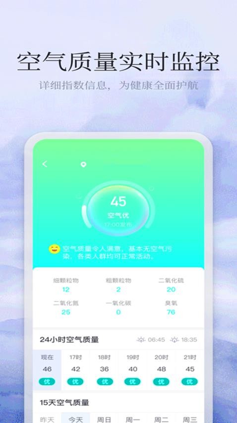 实时监测并显示PM2.5、PM10、臭氧等多项空气质量指标,提供专业的健康防护建议,特别适合敏感人群和注重健康的用户参考使用。
