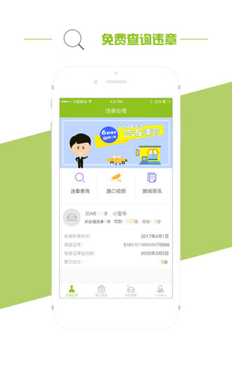 1.交通违法行为免费查询服务,支持实时查看违章记录和扣分情况;
