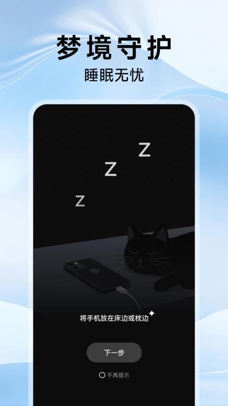5.然后根据系统信息提示将手机放在床边或枕边后,在点击下一步按钮。建议将手机放置在距离头部30-50厘米的位置,避免移动干扰监测结果。