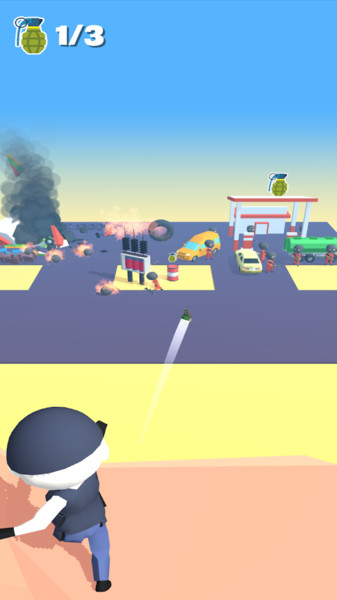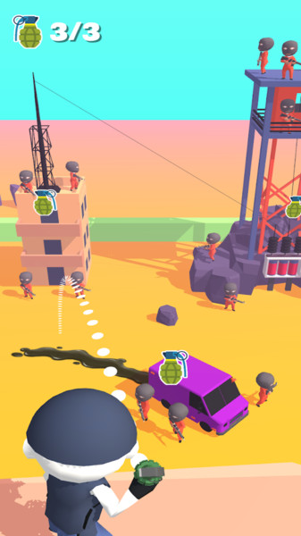 手榴弹轰炸是一款充满策略与技巧的休闲益智游戏。玩家需要精准控制投掷力度和角度,将有限的三颗手榴弹准确投向恐怖分子据点。游戏采用物理引擎模拟真实投掷轨迹,每次爆炸都会引发连锁反应,考验玩家的预判能力。独特的橡皮人画风既降低了设备性能要求,又增添了趣味性。随着关卡推进,敌人布局会越来越复杂,如何在有限弹药内完成任务将成为最大挑战。