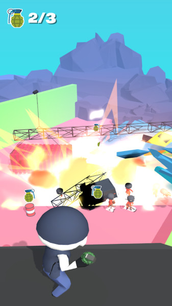 游戏采用低多边形美术风格,鲜艳的色块搭配动态光影效果,在保证流畅运行的同时营造出独特的视觉体验。爆炸时的慢动作特写和屏幕震动反馈带来极强的打击感,配合夸张的橡皮人肢体飞散效果,形成强烈的视觉冲击。精心调校的物理系统让每次投掷都有不同结果,玩家需要反复尝试才能掌握最佳爆破角度。关卡设计中隐藏着多个彩蛋成就,等待细心玩家发掘。