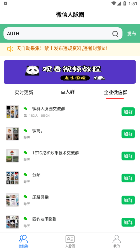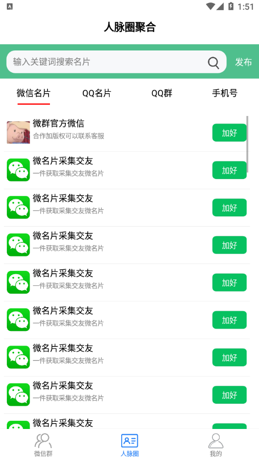 微群人脉圈app是一款专为拓展社交圈和商业人脉打造的智能加群工具。通过这款应用,用户可以轻松搜索并加入各类活跃微信群、QQ群,还能获取有价值的个人名片资源。平台采用实时更新机制,确保用户能接触到最新鲜的群组信息,无论是寻找行业交流群、学习资源群,还是商业合作群,都能在这里快速实现。特别适合销售人员、创业者、微商从业者等需要拓展人脉的用户群体,帮助他们在短时间内建立广泛的社交网络。
